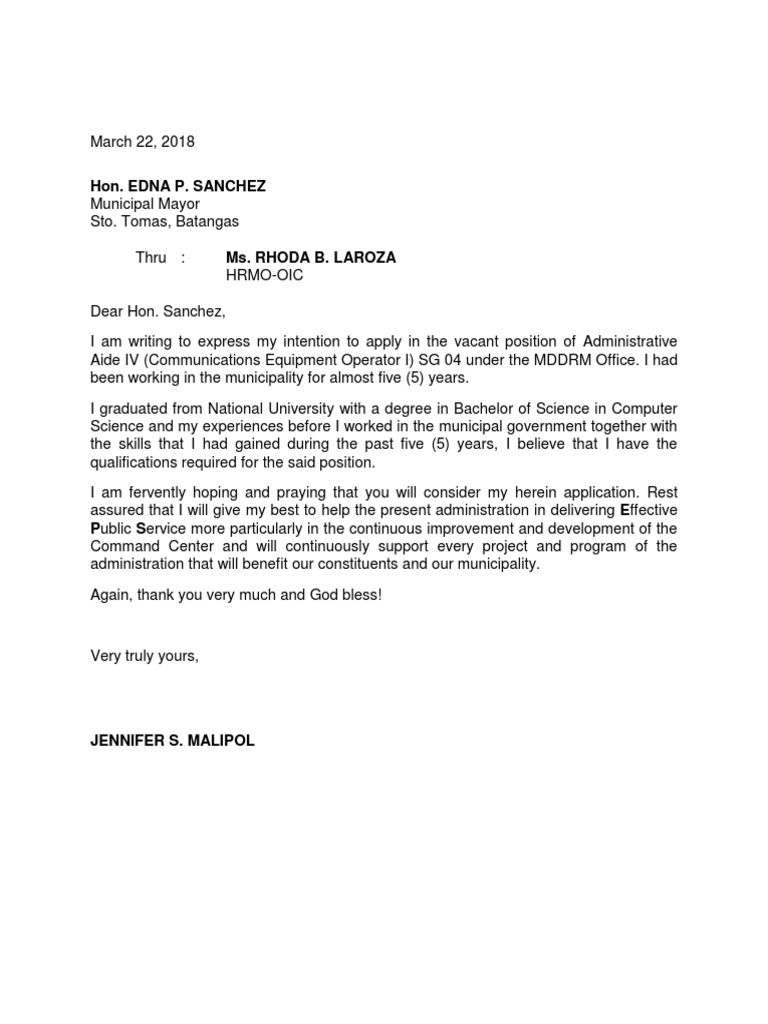 municipality and I strongly believe that I have the qualifications required for the said position.