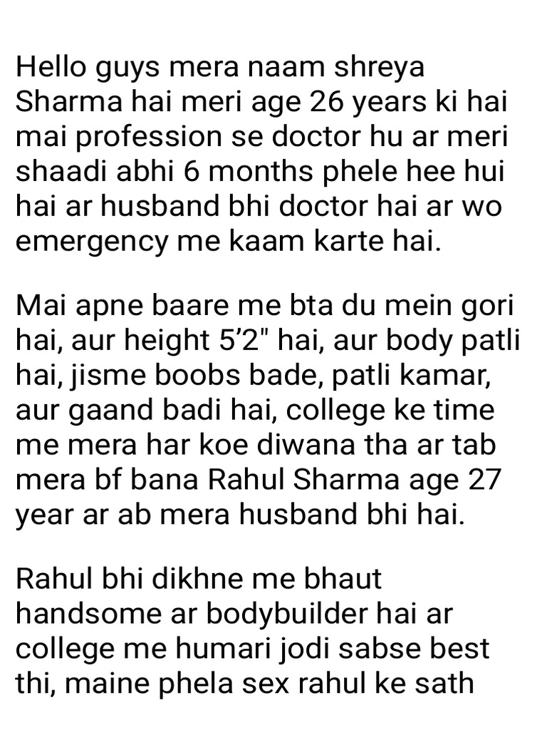The document is a personal narrative by a woman named Shreya Sharma, detailing her life as a 26-year-old doctor who recently married another doctor named Rahul. The story describes her experiences with her household staff, particularly a young servant named Karim, leading to inappropriate encounters that escalate over time. The narrative explores themes of desire, infidelity, and the consequences of her actions within the context of her marriage and societal expectations.
