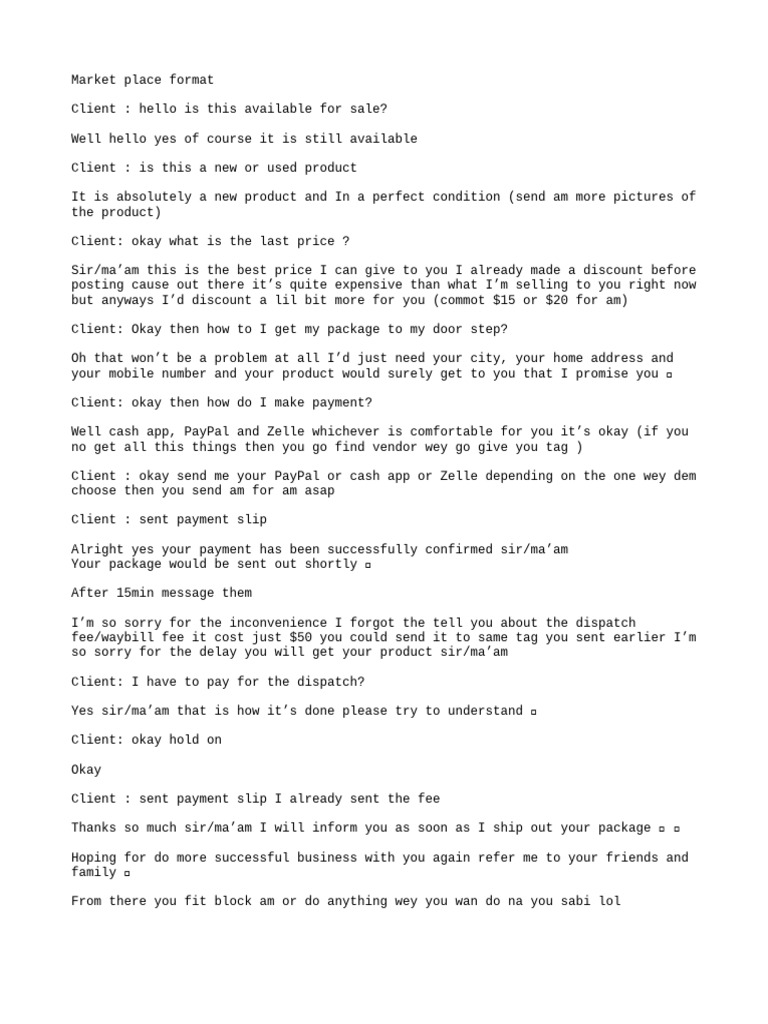 Client : okay send me your PayPal or cash app or Zelle depending on the one wey dem