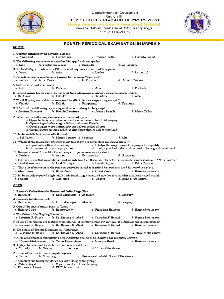 FOURTH PERIODICAL EXAMINATION IN MAPEH 9