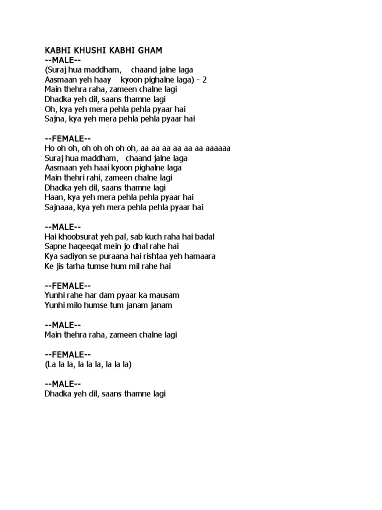 laga) - 2 Main thehra raha, zameen chalne lagi Dhadka yeh dil, saans thamne lagi Oh, kya yeh mera pehla pehla pyaar hai Sajna, kya yeh mera pehla pehla pyaar hai --FEMALE-Ho oh oh, oh oh oh oh oh, aa aa aa aa aa aa aaaaaa Suraj hua maddham, chaand jalne laga Aasmaan yeh haai kyoon pighalne laga Main thehri rahi, zameen chalne lagi Dhadka yeh dil, saans thamne lagi Haan, kya yeh mera pehla pehla pyaar hai Sajnaaa, kya yeh mera pehla pehla pyaar hai --MALE-Hai khoobsurat yeh pal, sab kuch raha hai badal Sapne haqeeqat mein jo dhal rahe hai Kya sadiyon se puraana hai rishtaa yeh hamaara Ke jis tarha tumse hum mil rahe hai --FEMALE-Yunhi rahe har dam pyaar ka mausam Yunhi milo humse tum janam janam --MALE-Main thehra raha, zameen chalne lagi --FEMALE-(La la la, la la la, la la la) --MALE-Dhadka yeh dil, saans thamne lagi