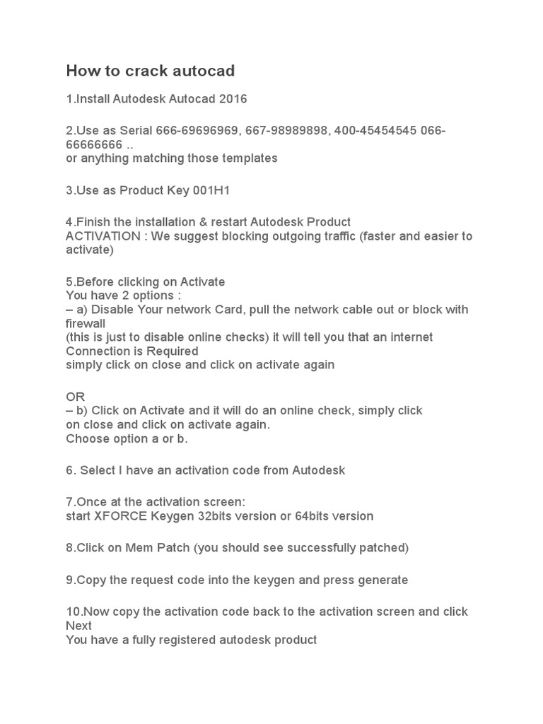 2.Use as Serial 666-69696969, 667-98989898, 400-45454545 06666666666 .. or anything matching those templates 3.Use as Product Key 001H1 4.Finish the installation & restart Autodesk Product ACTIVATION : We suggest blocking outgoing traffic (faster and easier to activate) 5.Before clicking on Activate You have 2 options : a) Disable Your network Card, pull the network cable out or block with firewall (this is just to disable online checks) it will tell you that an internet Connection is Required simply click on close and click on activate again OR b) Click on Activate and it will do an online check, simply click on close and click on activate again. Choose option a or b. 6. Select I have an activation code from Autodesk 7.Once at the activation screen: start XFORCE Keygen 32bits version or 64bits version 8.Click on Mem Patch (you should see successfully patched) 9.Copy the request code into the keygen and press generate 10.Now copy the activation code back to the activation screen and click Next You have a fully registered autodesk product