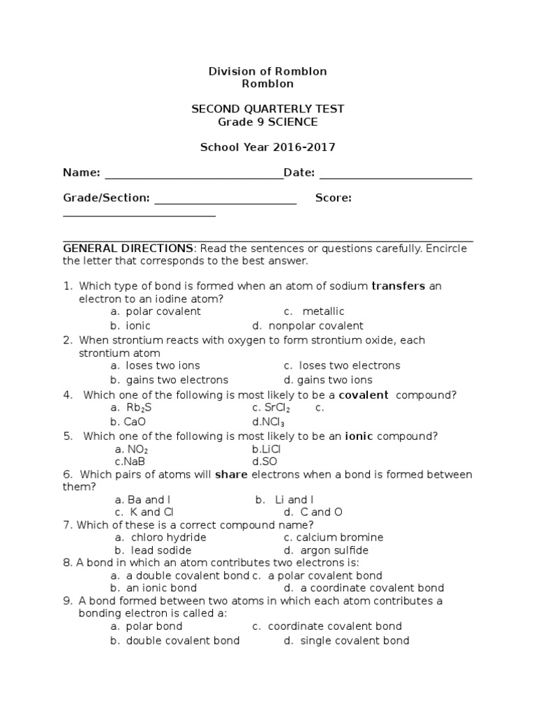 Quarterly Test in g9 Science 2nd Grading
