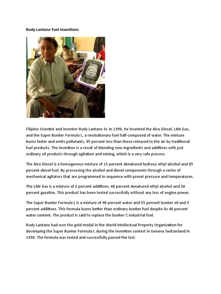 Filipino Scientist and inventor Rudy Lantano Sr. In 1996, he invented the Alco Diesel, LAN Gas,