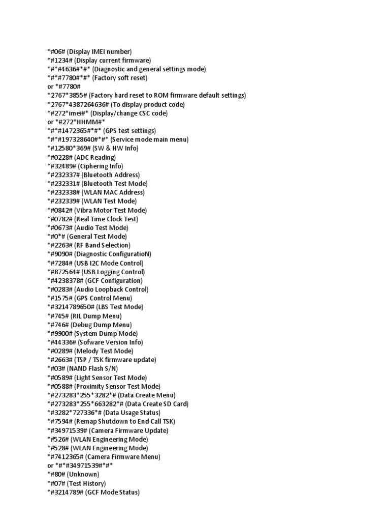 This document lists various secret codes that can be entered on a phone for diagnostic, testing, and configuration purposes. The codes allow accessing features like displaying IMEI numbers, firmware versions, factory resets, sensor testing, network locking, and more.
