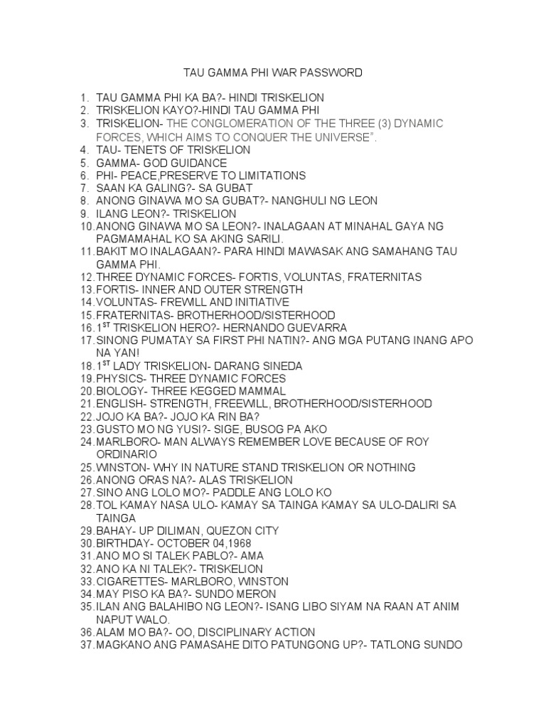 2. TRISKELION KAYO?-HINDI TAU GAMMA PHI 3. TRISKELION- THE CONGLOMERATION OF THE THREE (3) DYNAMIC FORCES, WHICH AIMS TO CONQUER THE UNIVERSE”. 4. TAU- TENETS OF TRISKELION 5. GAMMA- GOD GUIDANCE 6. PHI- PEACE,PRESERVE TO LIMITATIONS 7. SAAN KA GALING?- SA GUBAT 8. ANONG GINAWA MO SA GUBAT?- NANGHULI NG LEON 9. ILANG LEON?- TRISKELION 10. ANONG GINAWA MO SA LEON?- INALAGAAN AT MINAHAL GAYA NG PAGMAMAHAL KO SA AKING SARILI. 11. BAKIT MO INALAGAAN?- PARA HINDI MAWASAK ANG SAMAHANG TAU GAMMA PHI. 12. THREE DYNAMIC FORCES- FORTIS, VOLUNTAS, FRATERNITAS 13. FORTIS- INNER AND OUTER STRENGTH 14. VOLUNTAS- FREWILL AND INITIATIVE 15. FRATERNITAS- BROTHERHOOD/SISTERHOOD 16. 1ST TRISKELION HERO?- HERNANDO GUEVARRA 17. SINONG PUMATAY SA FIRST PHI NATIN?- ANG MGA PUTANG INANG APO NA YAN! 18. 1ST LADY TRISKELION- DARANG SINEDA 19. PHYSICS- THREE DYNAMIC FORCES 20. BIOLOGY- THREE KEGGED MAMMAL 21. ENGLISH- STRENGTH, FREEWILL, BROTHERHOOD/SISTERHOOD 22. JOJO KA BA?- JOJO KA RIN BA? 23. GUSTO MO NG YUSI?- SIGE, BUSOG PA AKO 24. MARLBORO- MAN ALWAYS REMEMBER LOVE BECAUSE OF ROY ORDINARIO 25. WINSTON- WHY IN NATURE STAND TRISKELION OR NOTHING 26. ANONG ORAS NA?- ALAS TRISKELION 27. SINO ANG LOLO MO?- PADDLE ANG LOLO KO 28. TOL KAMAY NASA ULO- KAMAY SA TAINGA KAMAY SA ULO-DALIRI SA TAINGA 29. BAHAY- UP DILIMAN, QUEZON CITY 30. BIRTHDAY- OCTOBER 04,1968 31. ANO MO SI TALEK PABLO?- AMA 32. ANO KA NI TALEK?- TRISKELION 33. CIGARETTES- MARLBORO, WINSTON 34. MAY PISO KA BA?- SUNDO MERON 35. ILAN ANG BALAHIBO NG LEON?- ISANG LIBO SIYAM NA RAAN AT ANIM NAPUT WALO. 36. ALAM MO BA?- OO, DISCIPLINARY ACTION 37. MAGKANO ANG PAMASAHE DITO PATUNGONG UP?- TATLONG SUNDO 38. ILANG PALIKO MULA DITO HANGGANG UP DILIMAN?- DALAWA 9LEFT & RIGHT) 39. BLUNO- GOOD 40. SUPERIO- BETTER 41. OPTEMO- BEST 42. ANONG KULAY NG MANGGA?- HINOG O HILAW? 43. 1ST RUMBLE- AUGUST 11,1975 44. DIGNITY- FEAR ALPHA KAPPA RHO 45. CODE NUMBER OF TRISKELION- 777 46. WHERE CAN YOU FIND THE RISING SUN?- IN EVERY OF TRISKELION’S HEART. 47. SIX FOUNDING FATHERS- RODOLFO STA. MARIA CONFESOR, ROY ALOLOR ORDINARIO, TALEK JAMIAS PABLO, VEDASTO SARIO VENIDA, RESTITUTO ALFONSO AND ROMEO FORTES 48. TRISKELION COLOR- GOLD OVER BLACK 49. GOLD OVER BLACK- LIGHT OVER DARKNESS OR LIGHT AGAINST DARKNESS 50. 777- SEVEN ANGELS, SEVEN PROPHETS , 7 TRUMPETS