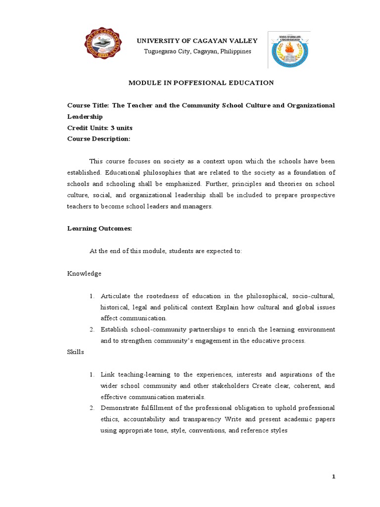 Course Title: The Teacher and the Community School Culture and Organizational